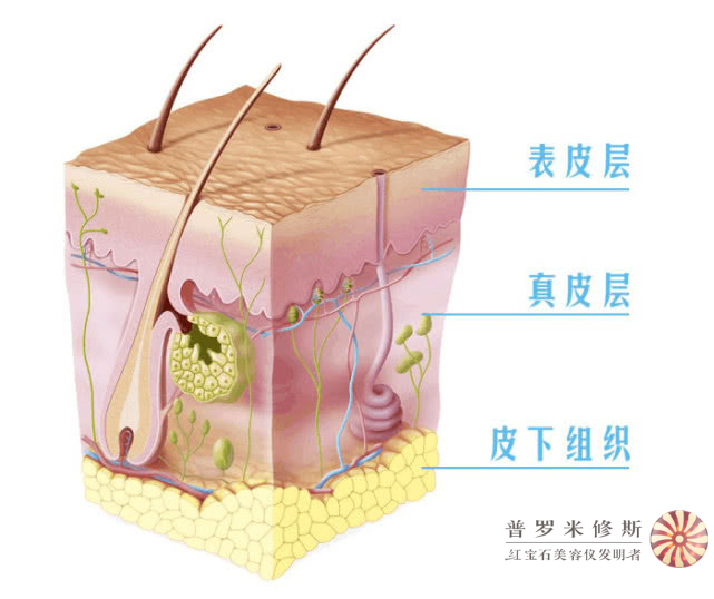 皮膚由外到內(nèi),分為表皮、z皮和皮下組織: