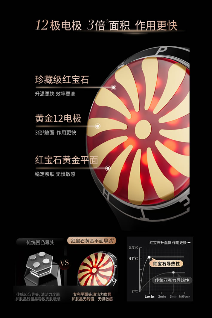 1.先來(lái)看它的導(dǎo)頭結(jié)構(gòu),它的導(dǎo)頭由12片黃金電極和紅寶石組成,電極片更多更大,接觸面面能量更聚集;開(kāi)機(jī)上臉1分鐘即熱,刺激膠原更高效。