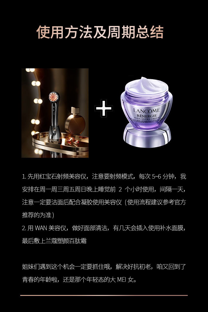 2.用完美容儀,做好面部清潔,有幾天會插入使用補(bǔ)水面膜,最后敷上蘭蔻塑顏百肽霜  姐妹們遇到這個機(jī)會一定要抓住哦,解決好抗初老,咱又回到了青春的年齡啦,還是那個年輕態(tài)的大美女。