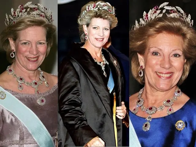 雖然希臘王室早已被廢除,希臘王室也流亡在外,希臘王后安妮-瑪麗仍然是很多王室的座上賓。上面這頂橄欖葉造型的紅寶石王冠是安妮-瑪麗王后所有王冠中比較重要的一頂,安妮-瑪麗戴著它出席了多場王室婚禮。王冠造型不錯,很大氣。