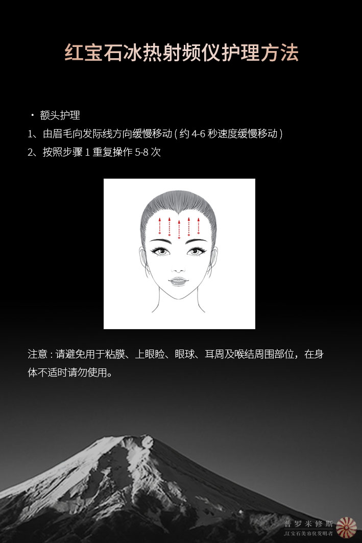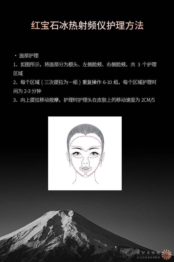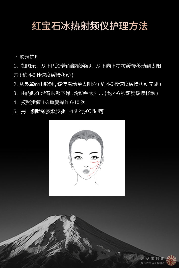 紅寶石冰熱射頻美容儀護(hù)理方法解讀 發(fā)布日期:2023-09-19 閱讀量: 紅寶石冰熱射頻美容儀護(hù)理怎么操作呢,有不少入手紅寶石冰熱射頻儀R3的朋友反饋不知道如何正確使用,今天就出一期護(hù)理步驟全面解讀,廢話不多說(shuō),上干貨: ·面部護(hù)理1、如圖所示,將面部分為額頭、左側(cè)臉頰、右側(cè)臉頰,共3個(gè)護(hù)理區(qū)域2、每個(gè)區(qū)域(三次提拉為一組)重復(fù)操作6-10組,每個(gè)區(qū)域護(hù)理時(shí)間為2-3分鐘3、向上提拉移動(dòng)按摩,護(hù)理時(shí)護(hù)理頭在皮膚上的移動(dòng)速度為2cm/S ·臉頰護(hù)理1、如圖示,從下巴沿著面部輪廓線,從下向上提拉緩慢移動(dòng)到太陽(yáng)穴(約4-6 秒速度緩慢移動(dòng))2、從鼻翼經(jīng)由臉頰,緩慢滑動(dòng)至太陽(yáng)穴(約 4-6 秒速度緩慢移動(dòng)完成)3、由內(nèi)眼角沿著眼部下緣,滑動(dòng)至太陽(yáng)穴(約 4-6 秒速度緩慢移動(dòng))4、按照步驟1-3 重復(fù)操作 6-10次5、另一側(cè)臉頰按照步驟1-4 進(jìn)行護(hù)理即可 ·額頭護(hù)理1、由眉毛向發(fā)際線方向緩慢移動(dòng) (約4-6秒速度緩慢移動(dòng))2、按照步驟1重復(fù)操作5-8次 注意:請(qǐng)避免用于粘膜、上眼瞼、眼球、耳周及喉結(jié)周圍部位,在身體不適時(shí)請(qǐng)勿使用。